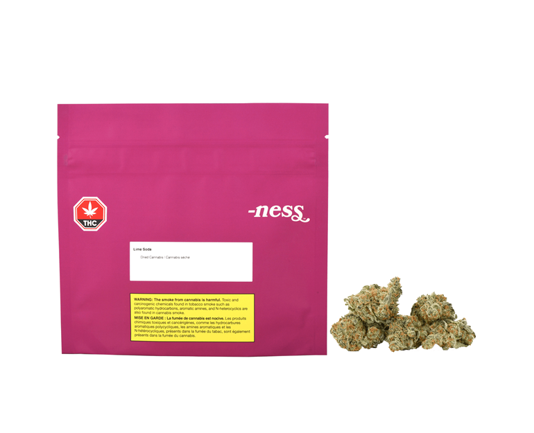 Lime Soda from -ness is a high-THC hybrid popping with sour and citrusy flavour from its unique terpene profile featuring myrcene, limonene, linalool. Bringing the best qualities of Grape Soda and Lime OG, this cultivar boasts dense, bright green buds threaded with orange pistils and generous trichome frosting. If we could ever describe a flower as effervescent, now would be the time! Explore Your -ness.