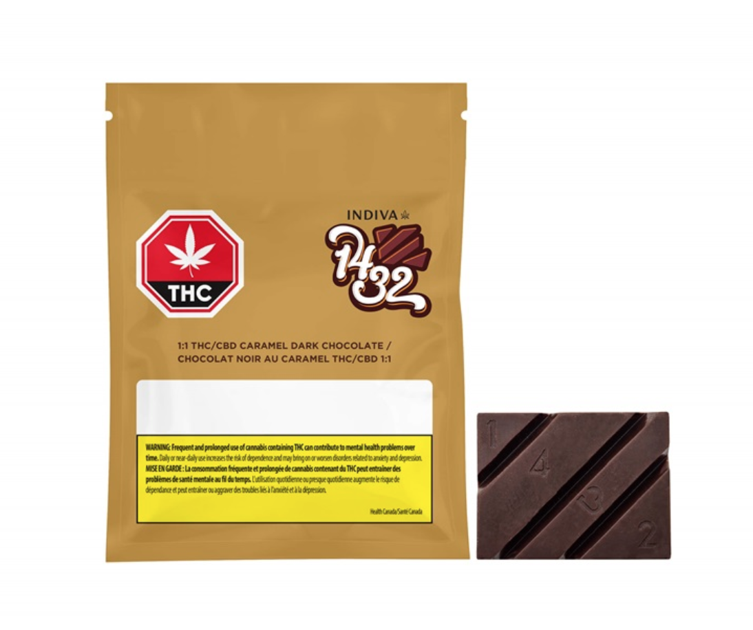 All Indiva 1432 chocolates are uniquely scored into 4mg, 3mg, 2mg, and 1mg pieces that are easy to break off to make dosing simple. Made with rich and delicious Callebaut dark chocolate and blended with caramel, each bite delivers a great balance of bittersweet, creamy and buttery flavours. This chocolate bar contains a 1:1 ratio of 10mg THC and 10mg CBD. Produced in Indiva's state-of-the-art facility in London, Ontario, Indiva 1432 Chocolates offer a cannabis-free flavour with just the right amount of sweetness.