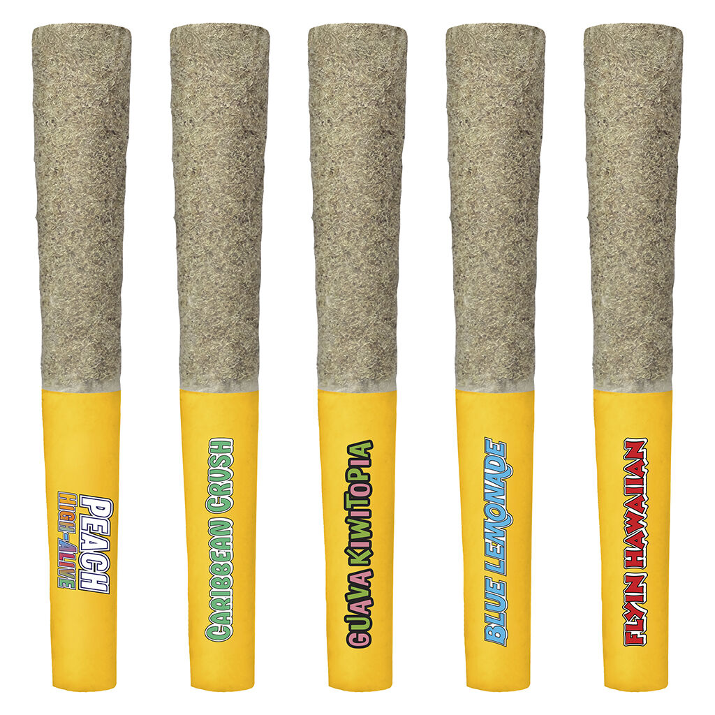 Enjoy a variety of fruit flavours with a liquid diamond punch. Peach High Alive, Caribbean Crush, Guava Kiwitopia, Blueberry Lemonade, and Flyin' Hawaiian are made with whole flower, infused with liquid diamonds and coated in kief.